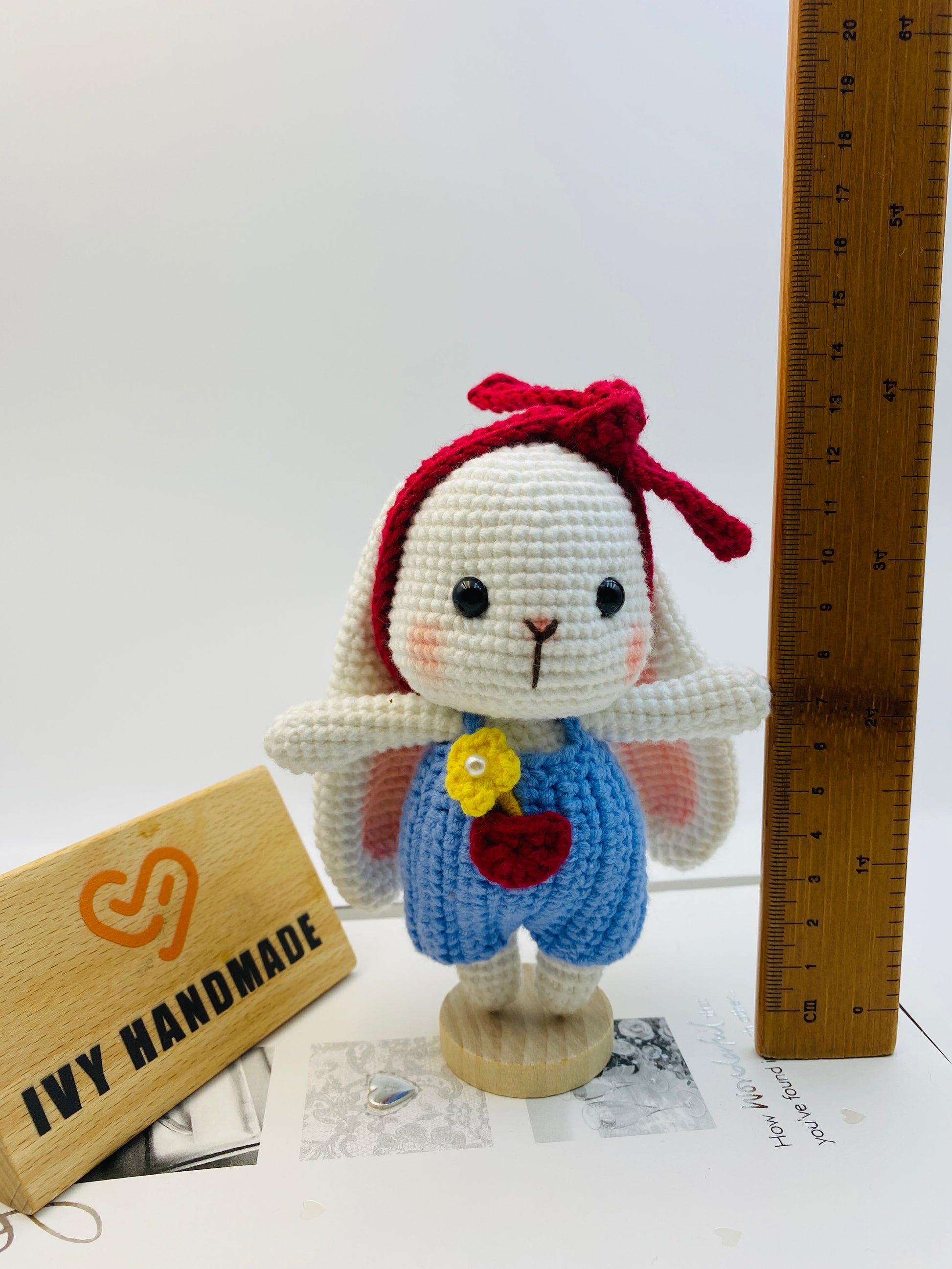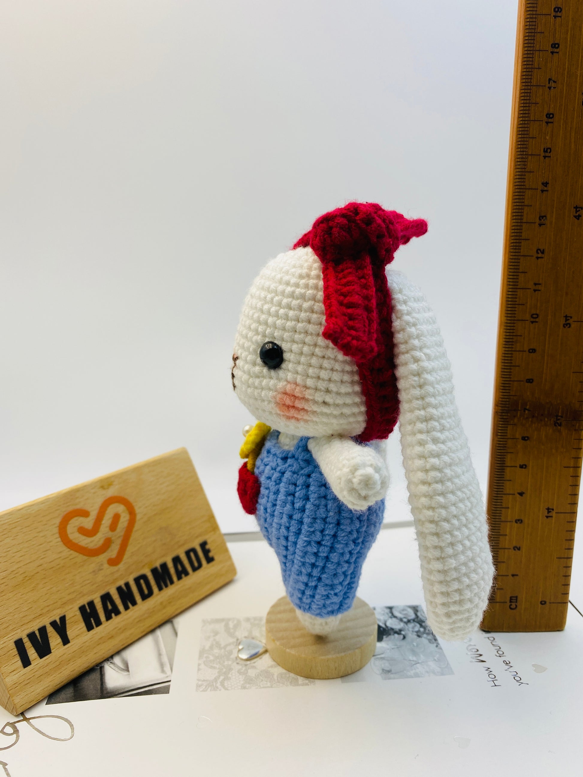This handmade crochet Big Eared Rabbit/Bunny is the perfect addition to your child's toy collection. Made with high-quality and soft cotton yarn, it provides a gentle and safe play experience for your little one. Plus, the adorable overalls add a touch of cuteness to this already charming toy.